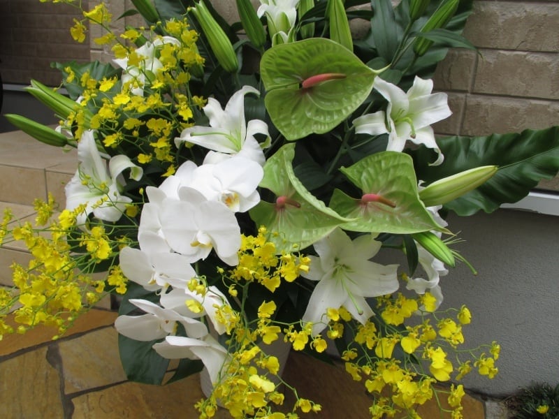 故人を偲ぶ気持ちを伝える、アレンジメントです。 白ユリ、オンシジューム、アンスリュームに清らかな胡蝶蘭が入った、優しい雰囲気のお花です。